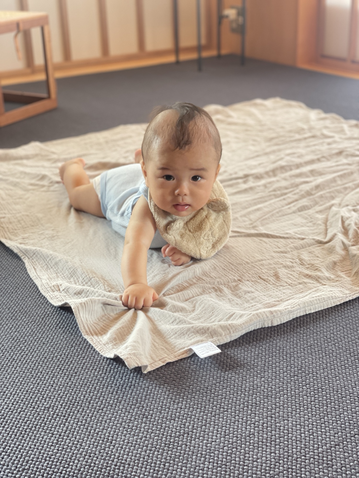 我が家の場合、子育て支援施設のオーナーさんに息子をみてもらったところ、「床時間」を増やすアドバイスをいただきました。生後6ヶ月にしては体の動きがまだ頼りなかったようです。